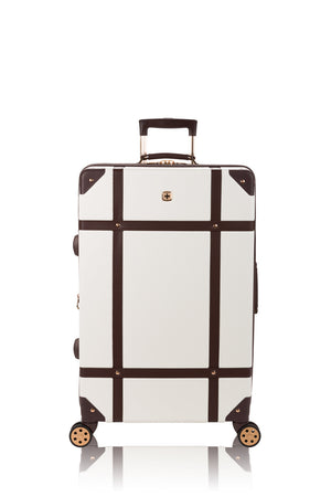 A retro case embellished with matching rose gold hardware and chocolate leather stripes, let this matchless trunk upgrade your travel experience. The SWISSGEAR 7739 26” Expandable Trunk Spinner Luggage splits into a functional abode to accommodate your must-haves. Featuring elastic tie-down clothing straps to ensure stable transportation of your clothes, it also entails a side packing pocket, two mesh elastic pockets, and a large zippered packing compartment.